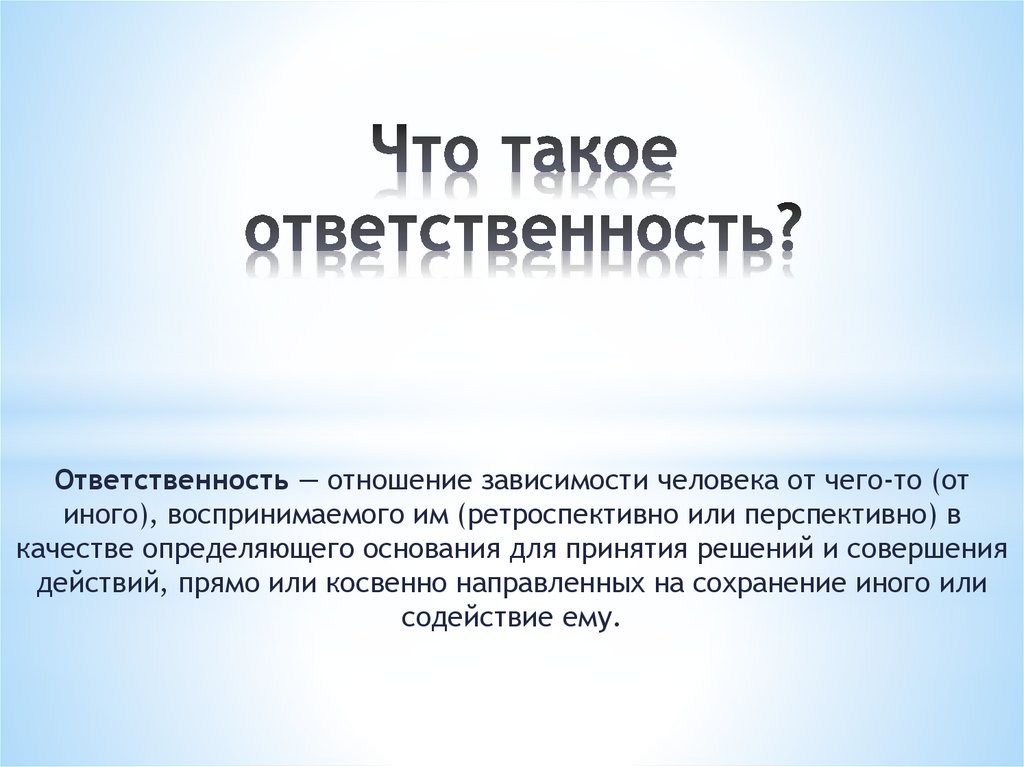 Ответственность — отношение зависимости человека от чего-то (отиного), воспринимаемого им (ретроспективно или перспективно) в