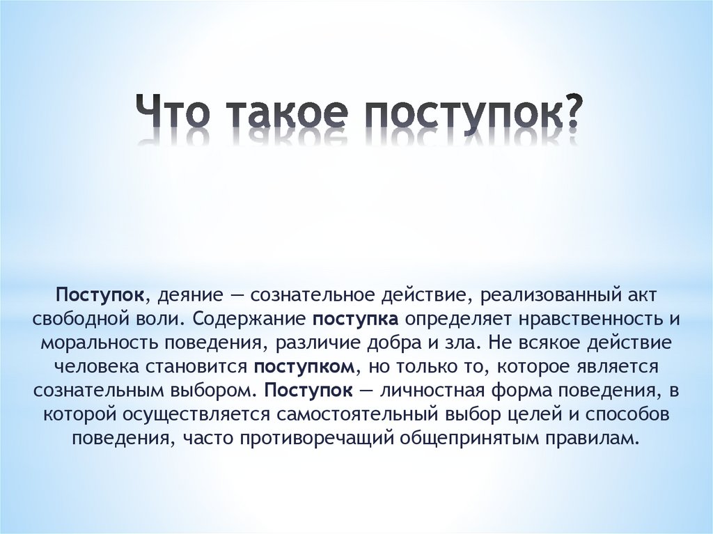 Поступок, деяние — сознательное действие, реализованный актсвободной воли. Содержание поступка определяет нравственность и