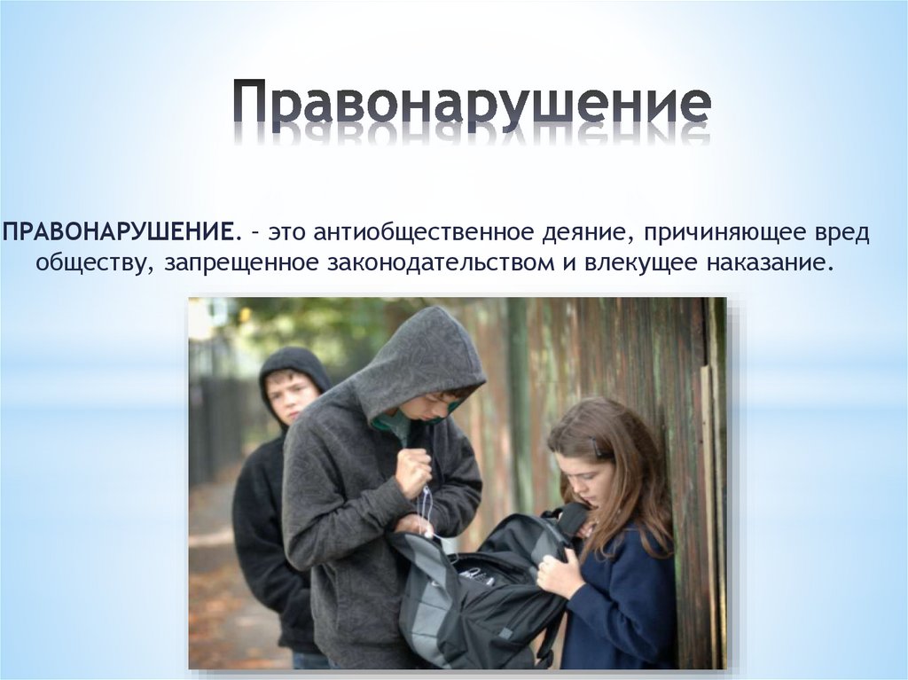 ПРАВОНАРУШЕНИЕ. – это антиобщественное деяние, причиняющее вредобществу, запрещенное законодательством и влекущее наказание.