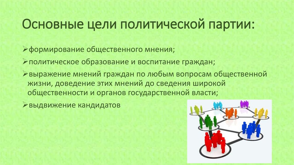 Основные цели политической партии:формирование общественного мнения;