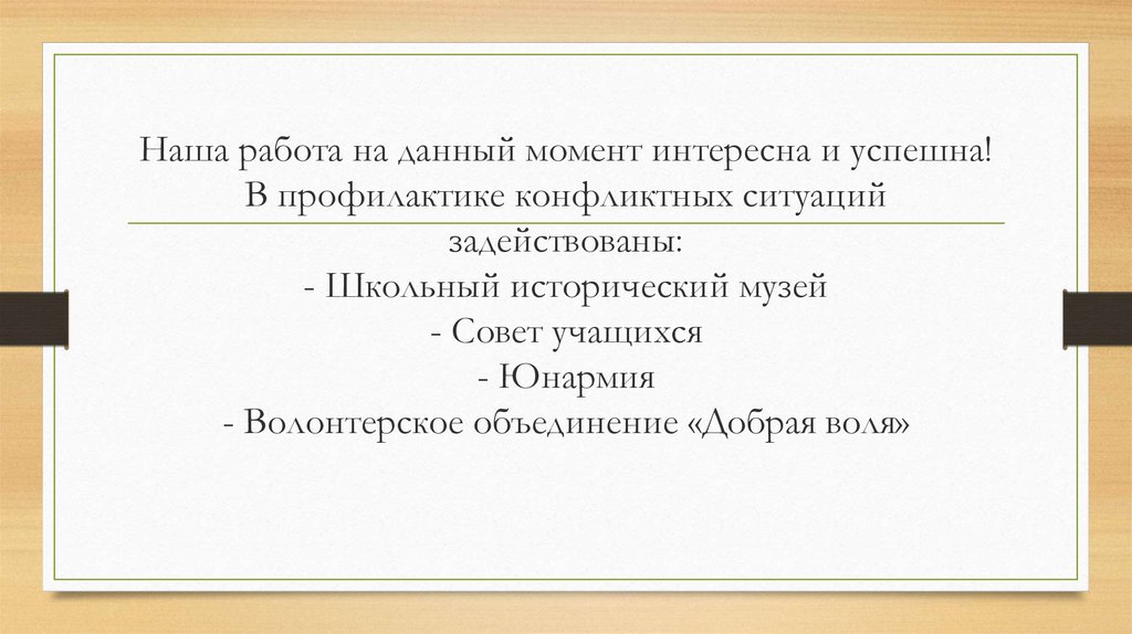 Наша работа на данный момент интересна и успешна!В профилактике конфликтных ситуаций