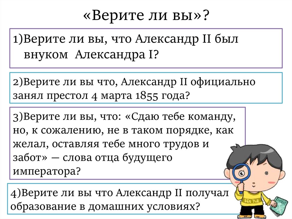 «Верите ли вы»?1)Верите ли вы, что Александр II был