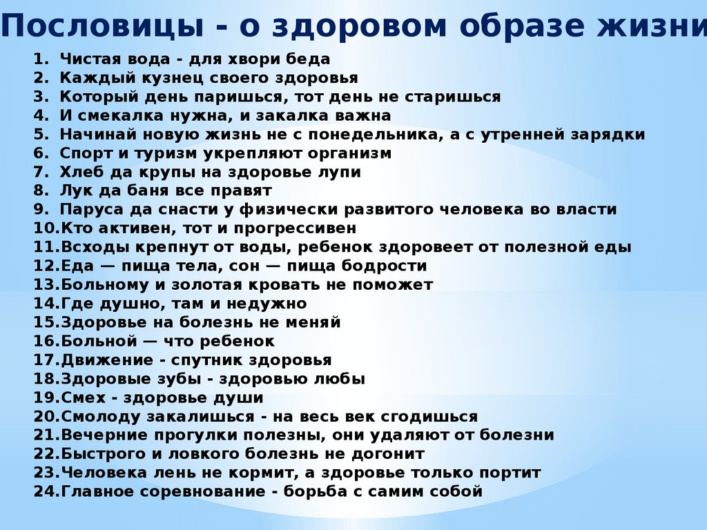 Пословицы - о здоровом образе жизни1. Чистая вода - для хвори беда