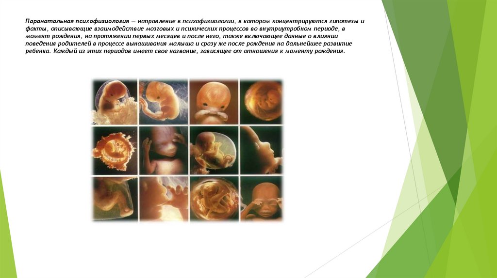 Паранатальная психофизиология — направление в психофизиологии, в котором концентрируются гипотезы ифакты, описывающие взаимодействие мозговых и психических процессов во внутриутробном периоде, в