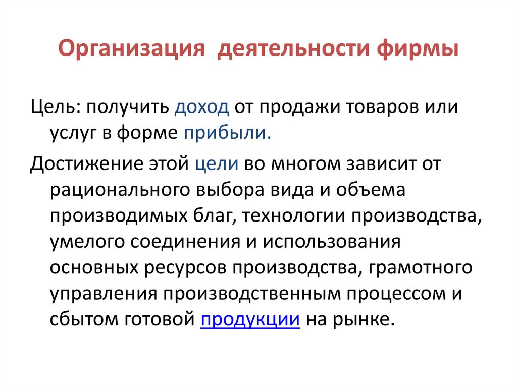Организация деятельности фирмыЦель: получить доход от продажи товаров или