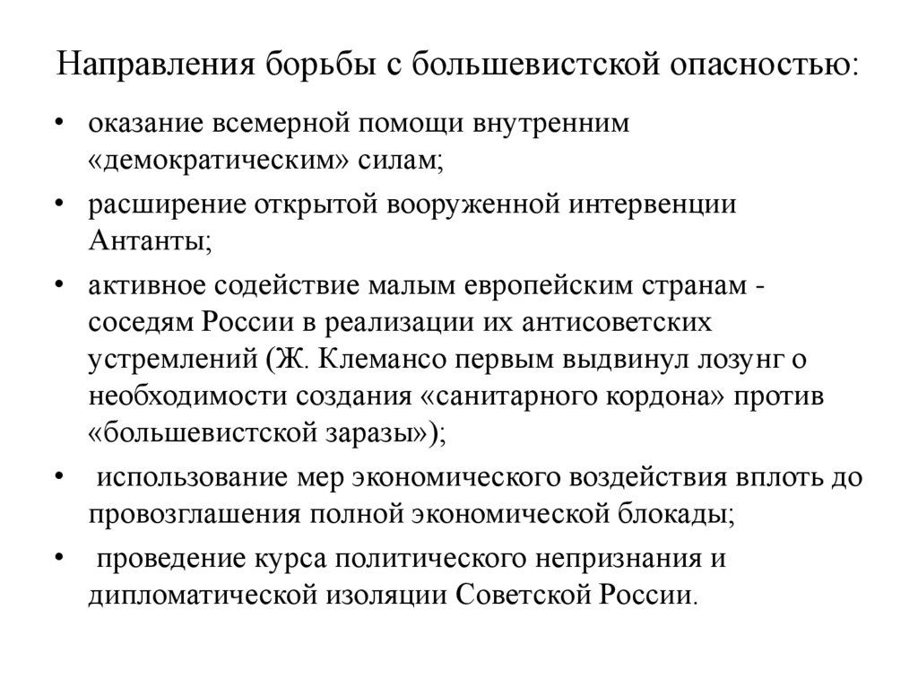 Направления борьбы с большевистской опасностью:• оказание всемерной помощи внутренним