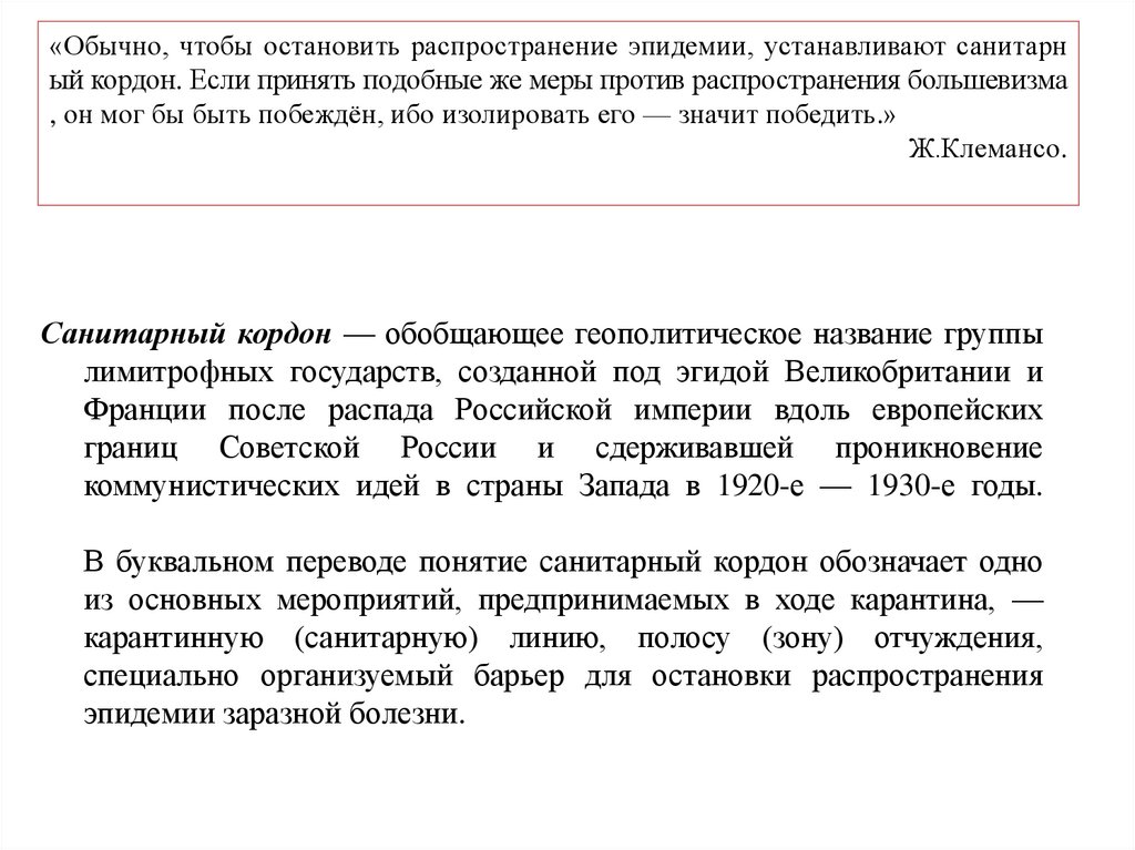 «Обычно, чтобы остановить распространение эпидемии, устанавливают санитарный кордон. Если принять подобные же меры против распространения большевизма