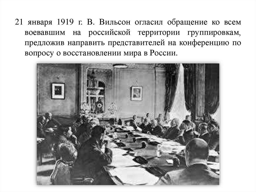 21 января 1919 г. В. Вильсон огласил обращение ко всемвоевавшим на российской территории группировкам,