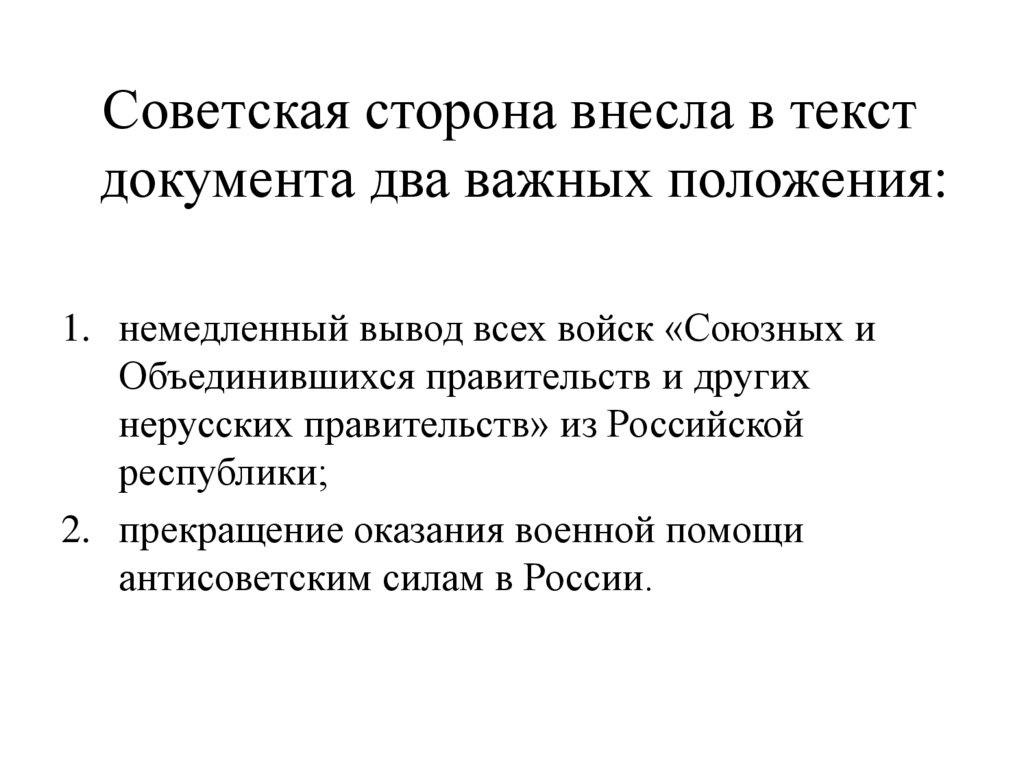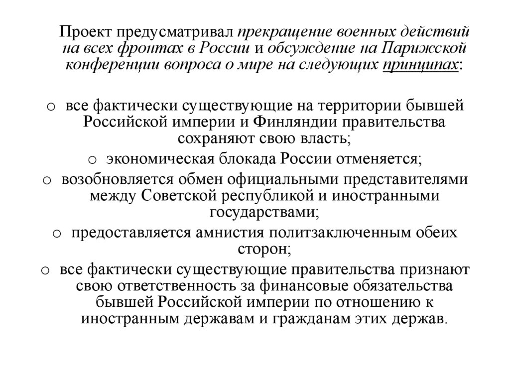 Проект предусматривал прекращение военных действийна всех фронтах в России и обсуждение на Парижской