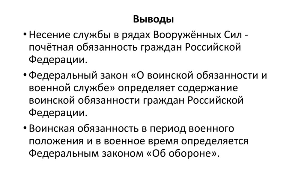 Выводы• Несение службы в рядах Вооружённых Сил почётная обязанность граждан Российской