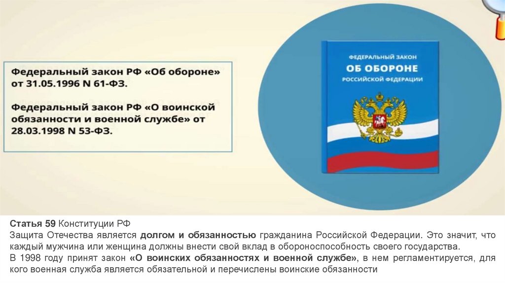 Статья 59 Конституции РФЗащита Отечества является долгом и обязанностью гражданина Российской Федерации. Это значит, что