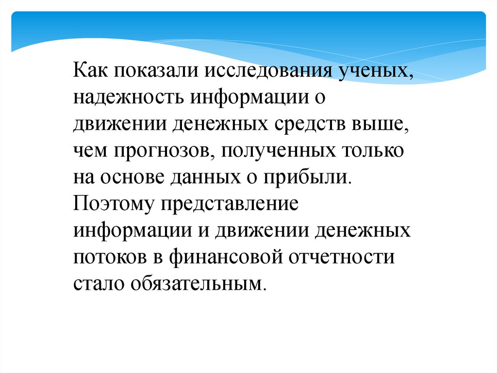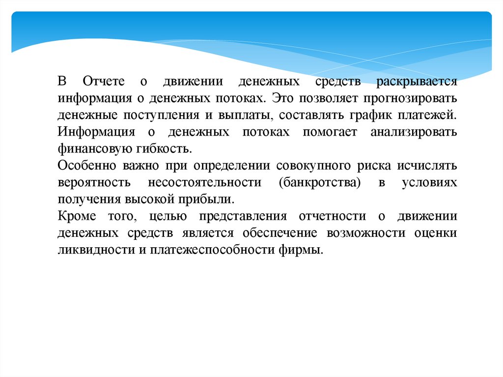 В Отчете о движении денежных средств раскрываетсяинформация о денежных потоках. Это позволяет прогнозировать