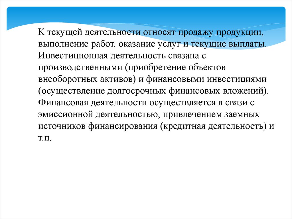 К текущей деятельности относят продажу продукции,выполнение работ, оказание услуг и текущие выплаты.