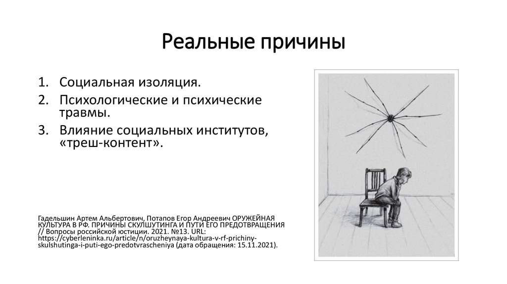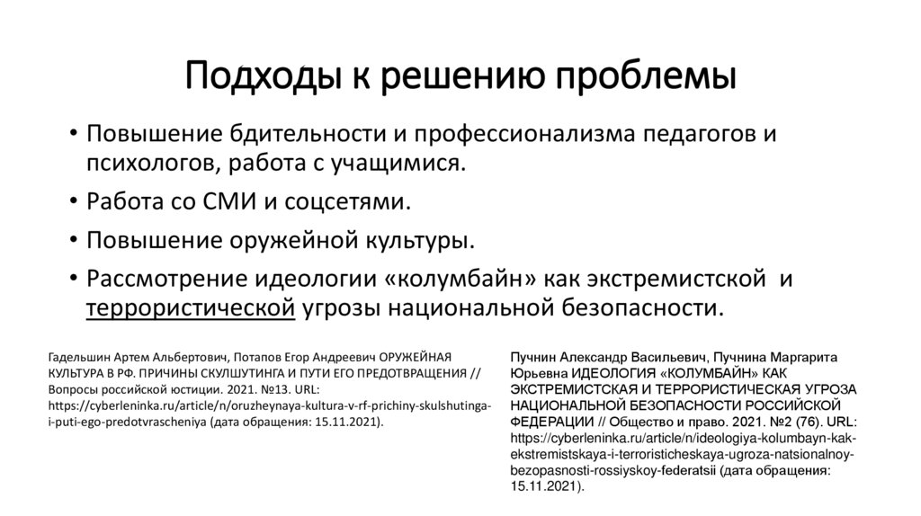 https://cyberleninka.ru/article/n/oruzheynaya-kultura-v-rf-prichiny-skulshutingai-puti-ego-predotvrascheniya (дата обращения: 15.11.2021).