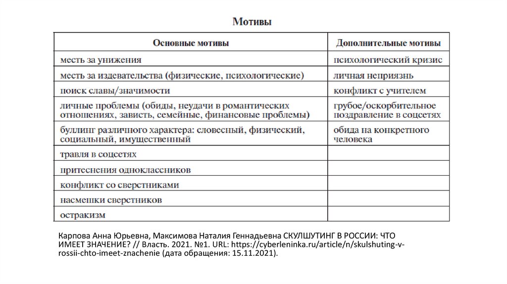 Карпова Анна Юрьевна, Максимова Наталия Геннадьевна СКУЛШУТИНГ В РОССИИ: ЧТОИМЕЕТ ЗНАЧЕНИЕ? // Власть. 2021. №1. URL: https://cyberleninka.ru/article/n/skulshuting-vrossii-chto-imeet-znachenie (дата обращения: 15.11.2021).