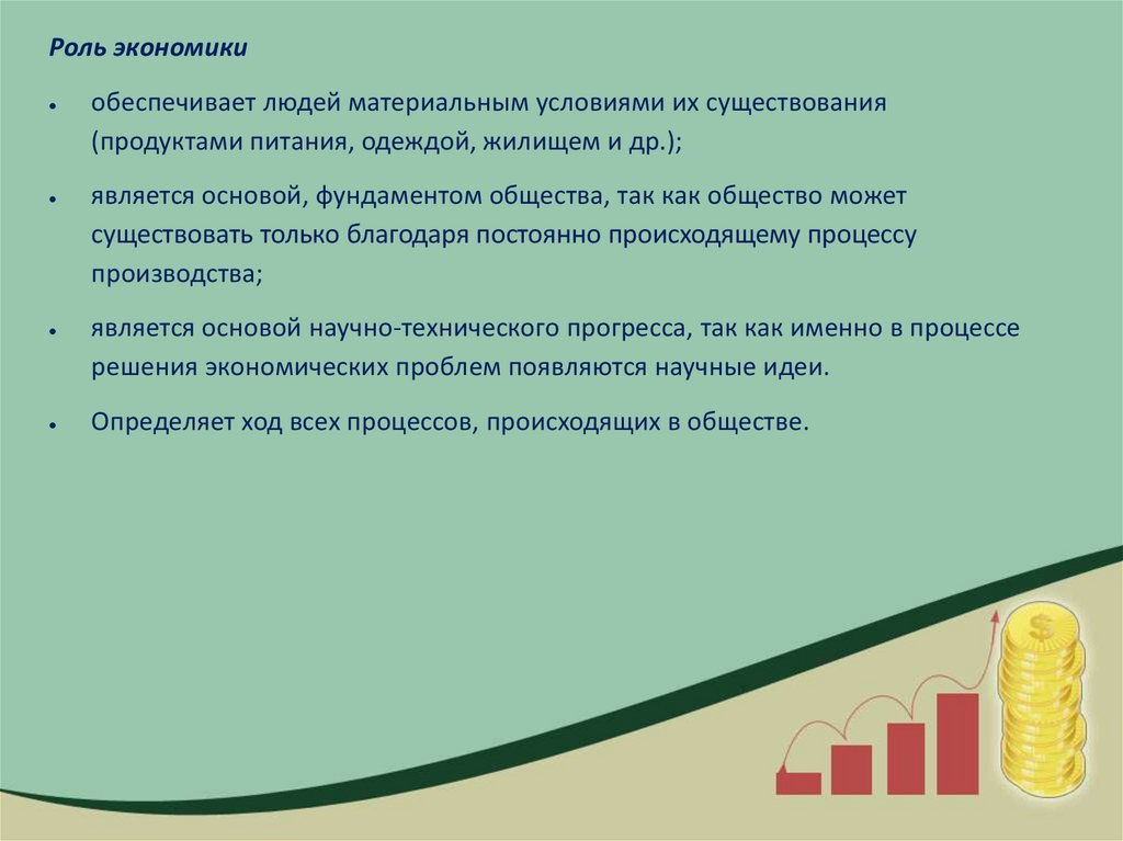 Роль экономикиобеспечивает людей материальным условиями их существования