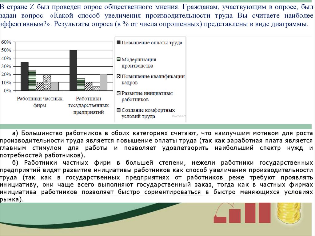 В стране Z был проведён опрос общественного мнения. Гражданам, участвующим в опросе, былзадан вопрос: «Какой способ увеличения производительности труда Вы считаете наиболее