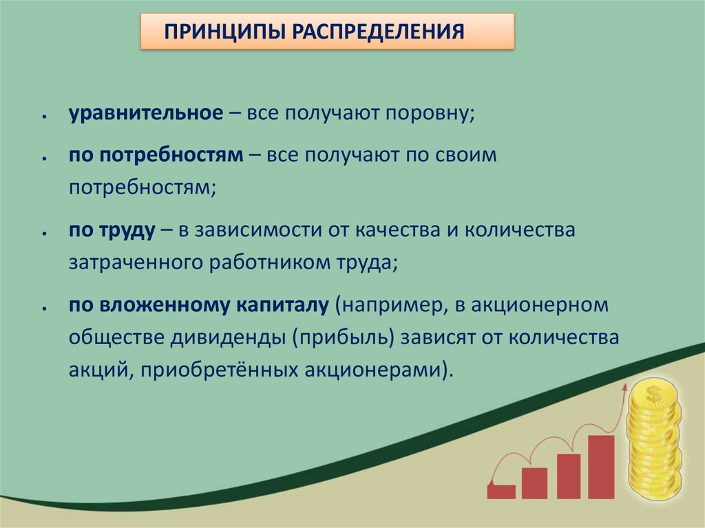 ПРИНЦИПЫ РАСПРЕДЕЛЕНИЯуравнительное – все получают поровну;