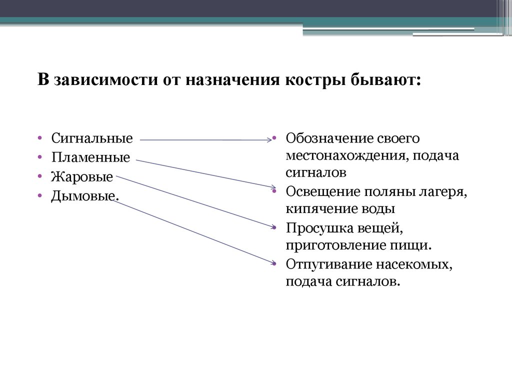 В зависимости от назначения костры бывают:Сигнальные