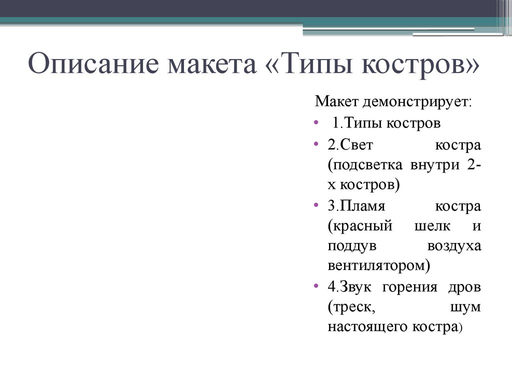 Описание макета «Типы костров»Макет демонстрирует: