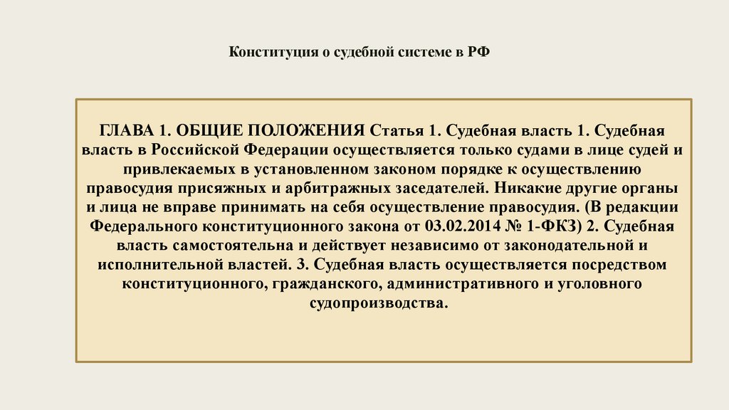Конституция о судебной системе в РФГЛАВА 1. ОБЩИЕ ПОЛОЖЕНИЯ Статья 1. Судебная власть 1. Судебная