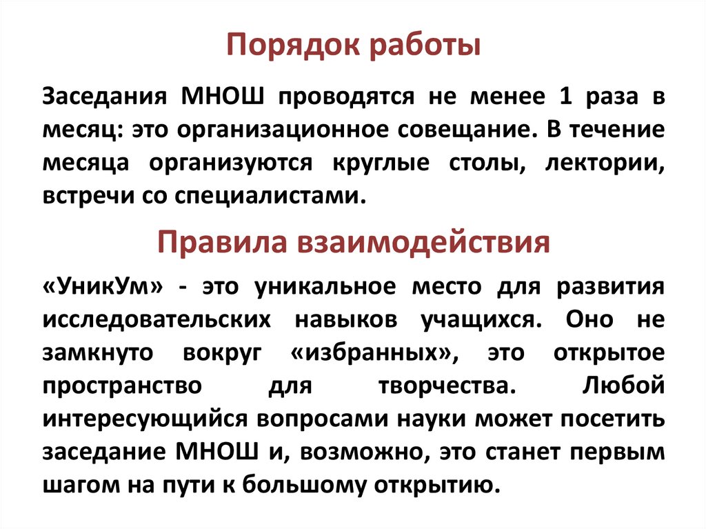 Порядок работыЗаседания МНОШ проводятся не менее 1 раза в