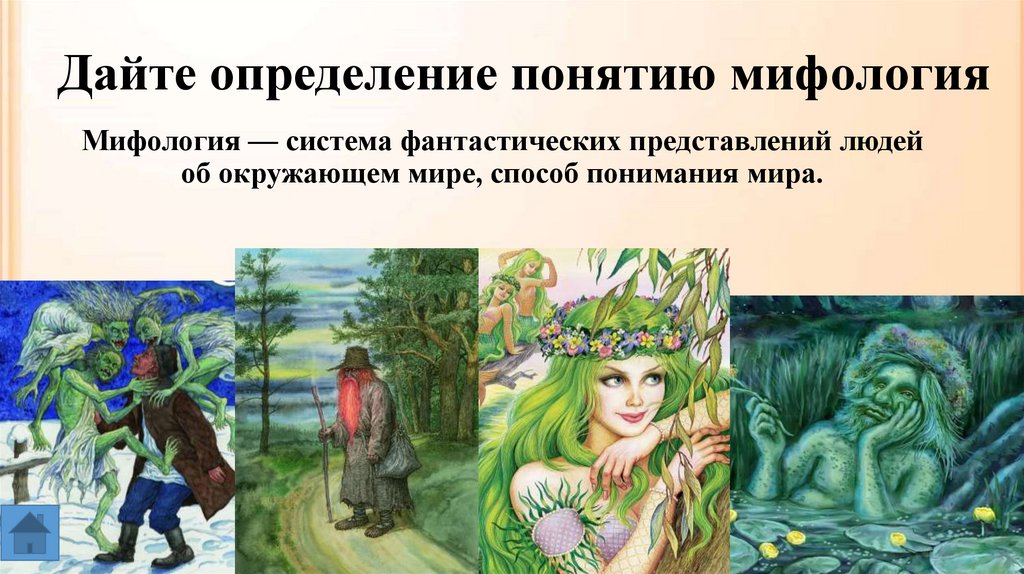 Дайте определение понятию мифологияМифология — система фантастических представлений людей