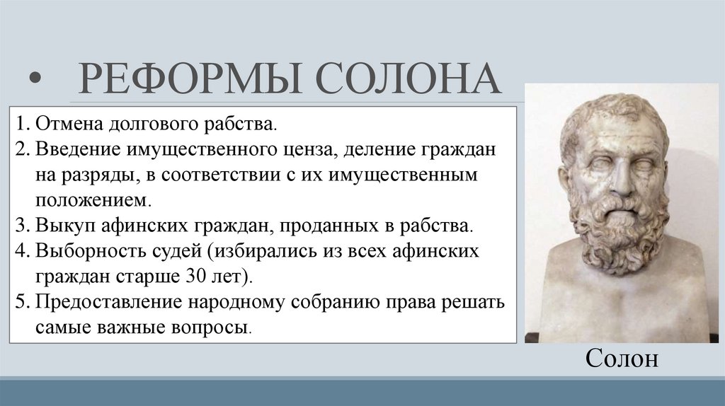 • РЕФОРМЫ СОЛОНА1. Отмена долгового рабства.