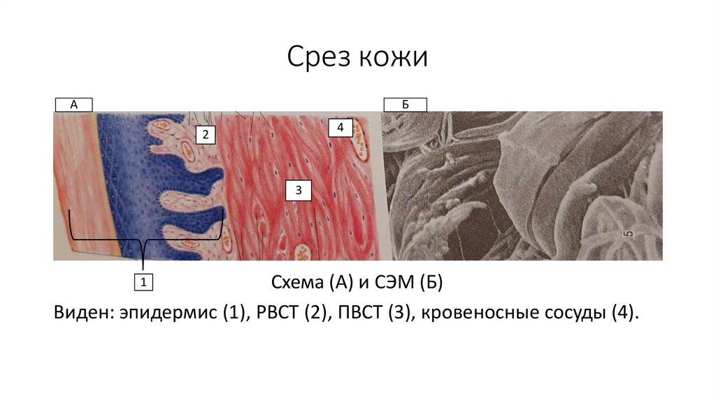 Виден: эпидермис (1), РВСТ (2), ПВСТ (3), кровеносные сосуды (4).