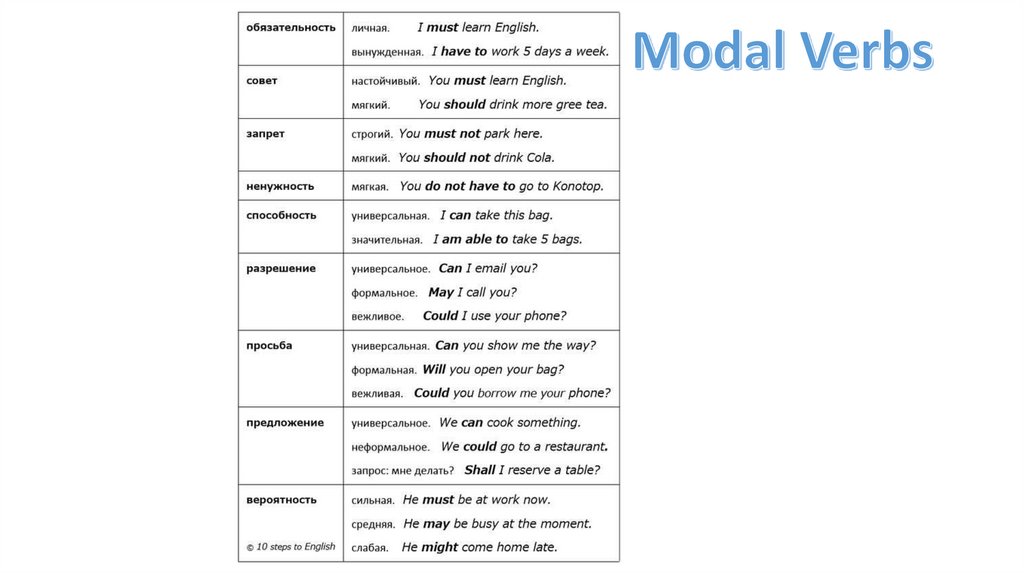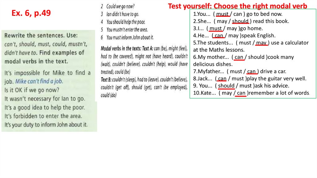 Ex. 6, p.49Test yourself: Choose the right modal verb