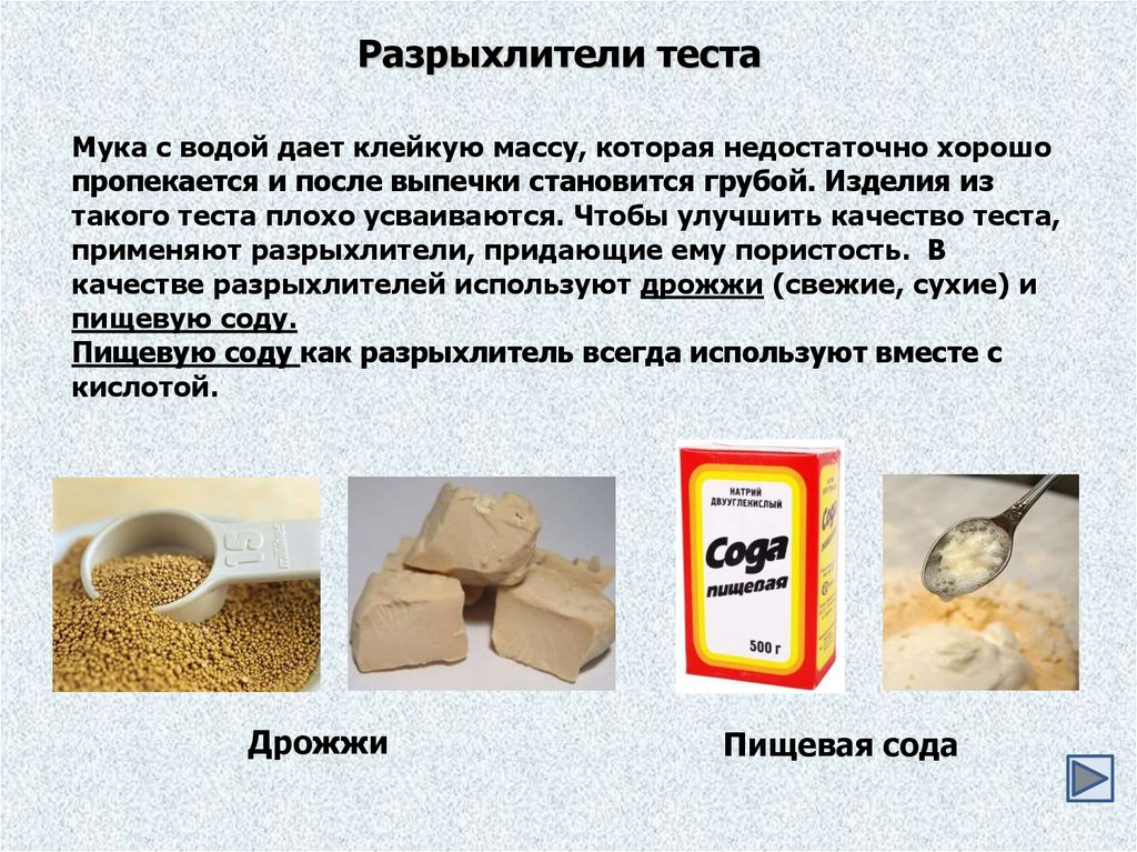 Разрыхлители тестаМука с водой дает клейкую массу, которая недостаточно хорошо