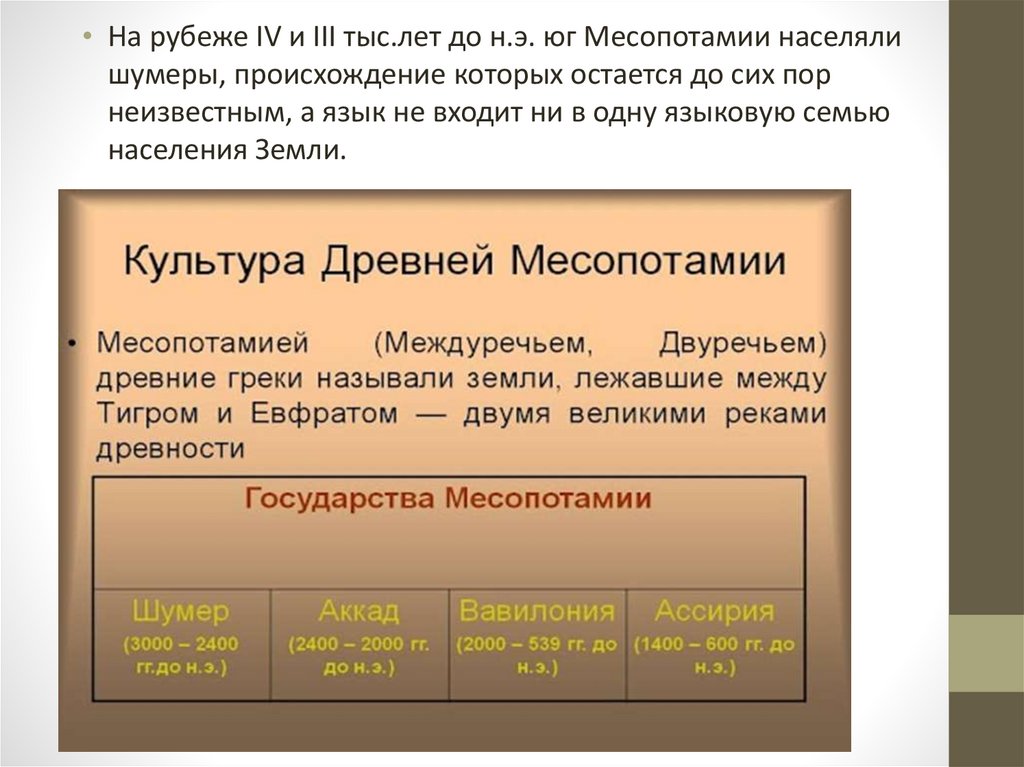 • На рубеже IV и III тыс.лет до н.э. юг Месопотамии населялишумеры, происхождение которых остается до сих пор