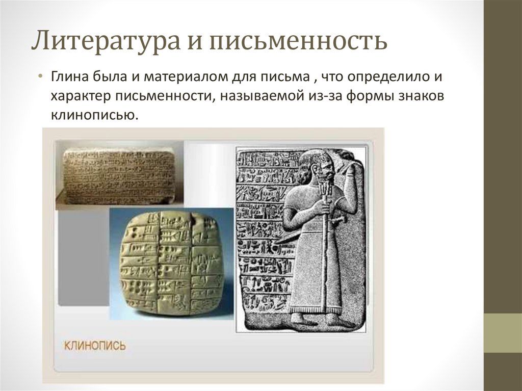 Литература и письменность• Глина была и материалом для письма , что определило и