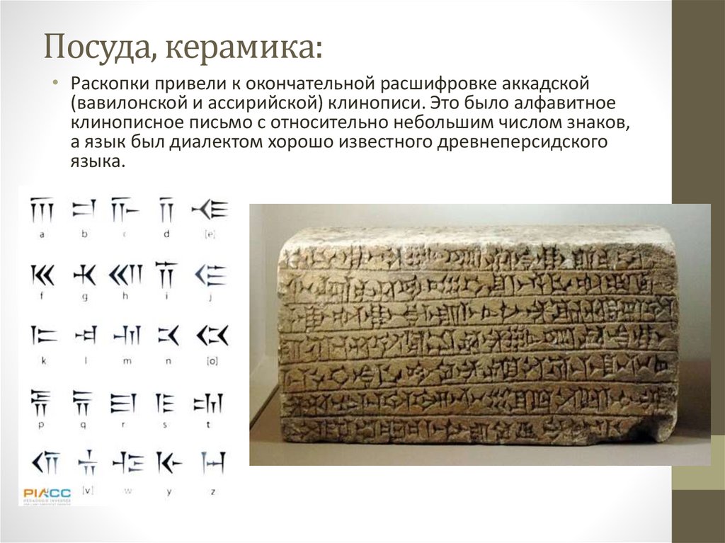 Посуда, керамика:• Раскопки привели к окончательной расшифровке аккадской