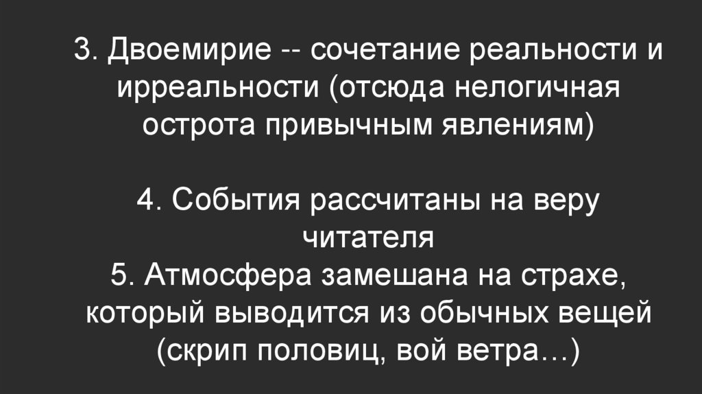 3. Двоемирие -- сочетание реальности иирреальности (отсюда нелогичная