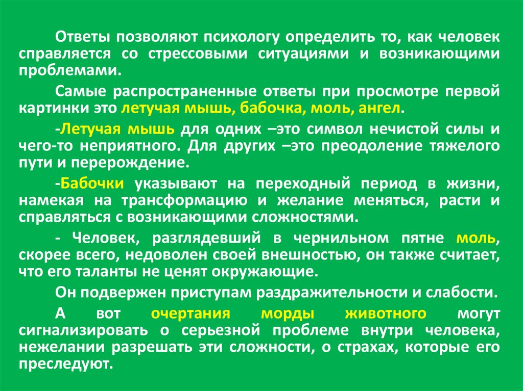 Ответы позволяют психологу определить то, как человексправляется со стрессовыми ситуациями и возникающими