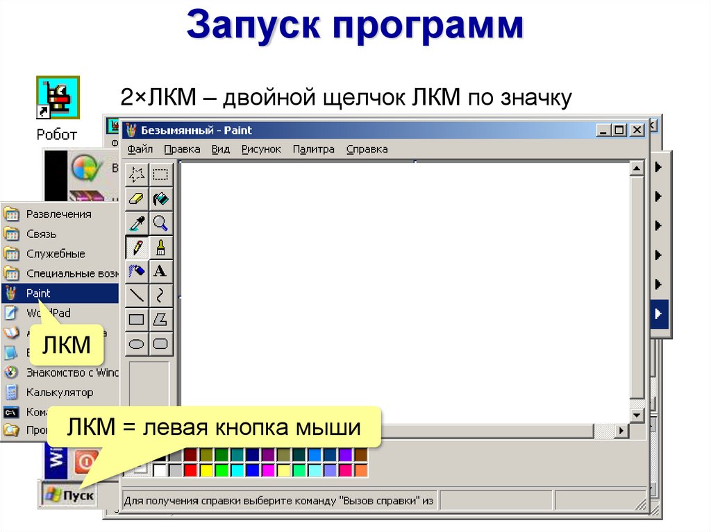 Запуск программ2×ЛКМ – двойной щелчок ЛКМ по значку