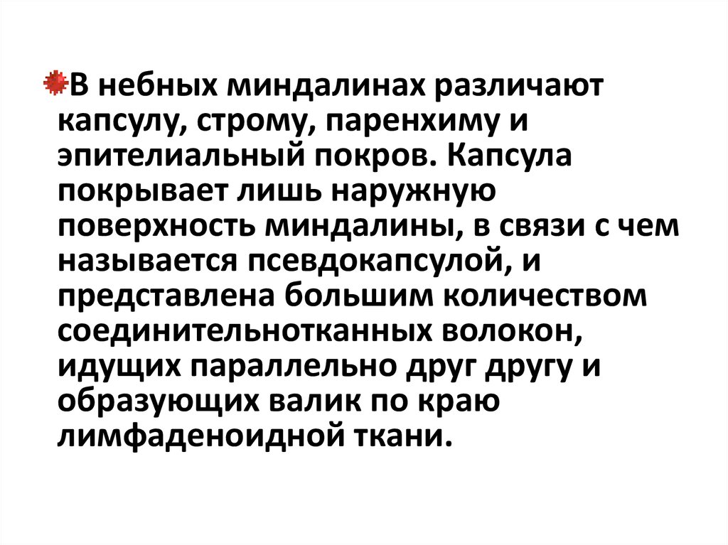 В небных миндалинах различаюткапсулу, строму, паренхиму и