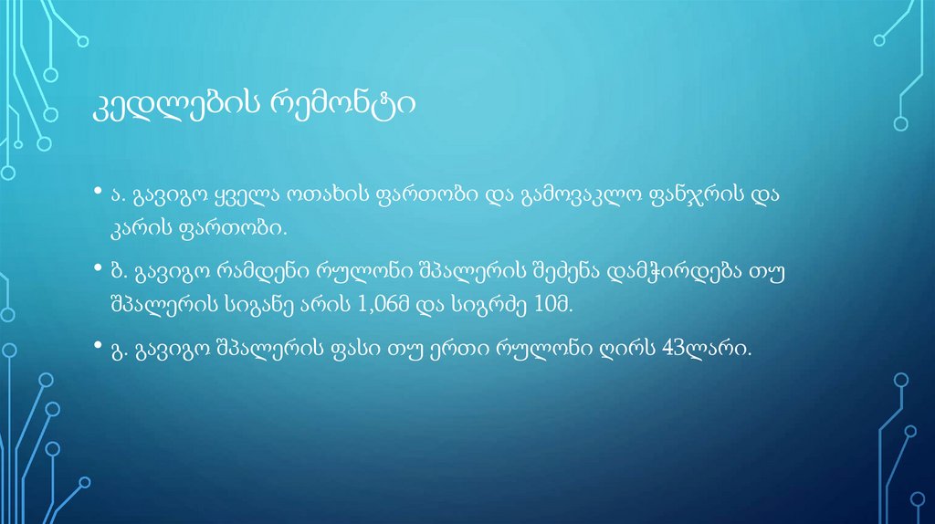 კედლების რემონტი• ა. გავიგო ყველა ოთახის ფართობი და გამოვაკლო ფანჯრის და