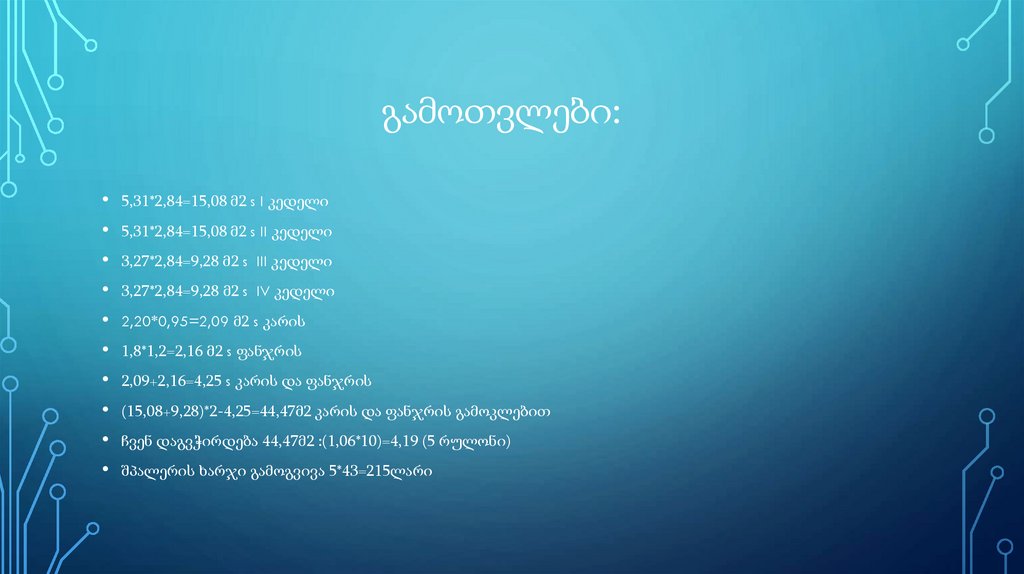 გამოთვლები:5,31*2,84=15,08 მ2 s I კედელი