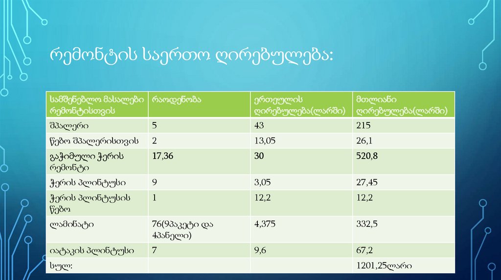 რემონტის საერთო ღირებულება:სამშენებლო მასალები რაოდენობა