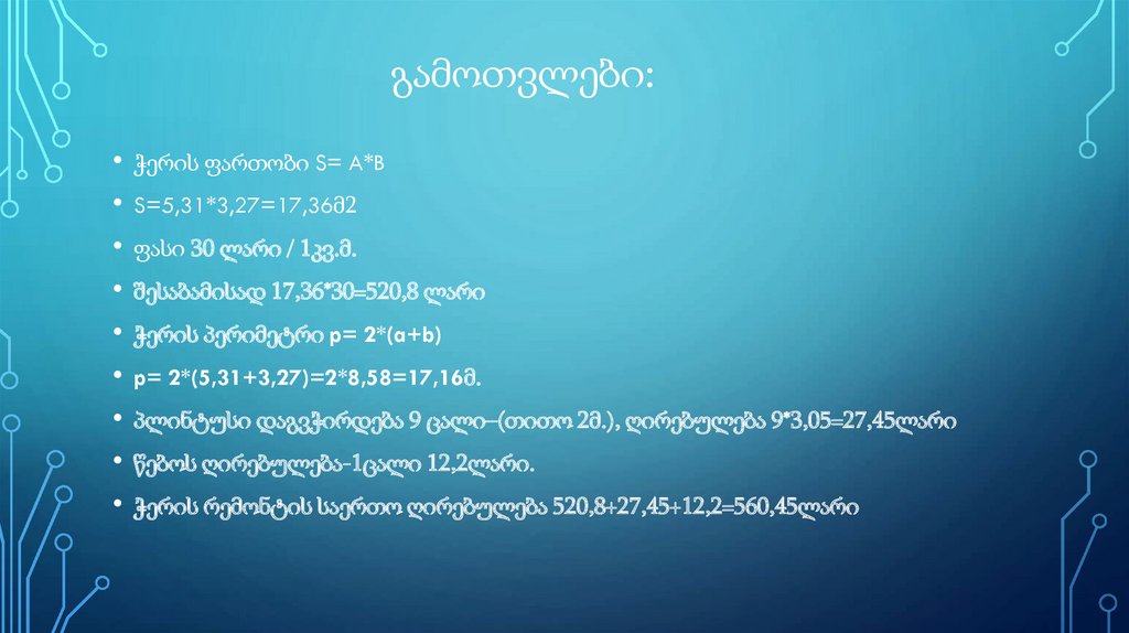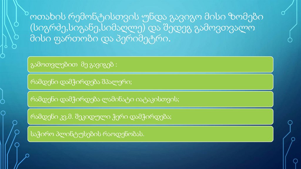 ოთახის რემონტისთვის უნდა გავიგო მისი ზომები(სიგრძე,სიგანე,სიმაღლე) და შედეგ გამოვთვალო