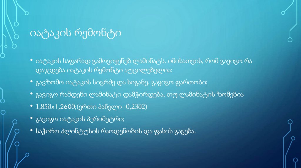 იატაკის რემონტიიატაკის საფარად გამოვიყენებ ლამინატს. იმისათვის, რომ გავიგო რა