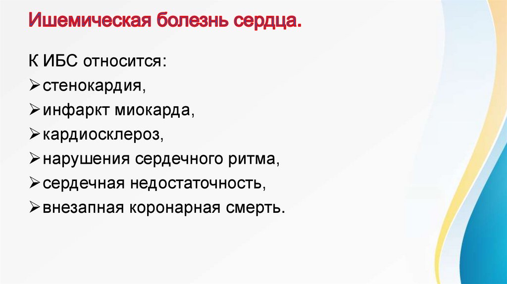 Стенокардия (одна из распространенных форм ИБС).Основной