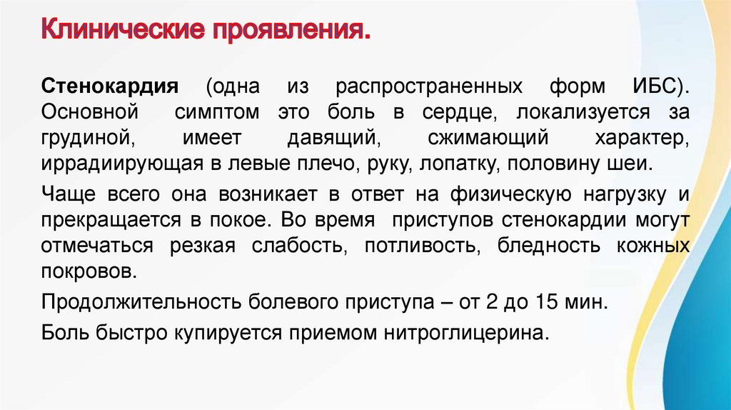 прекращается в покое. Во время приступов стенокардии могут
