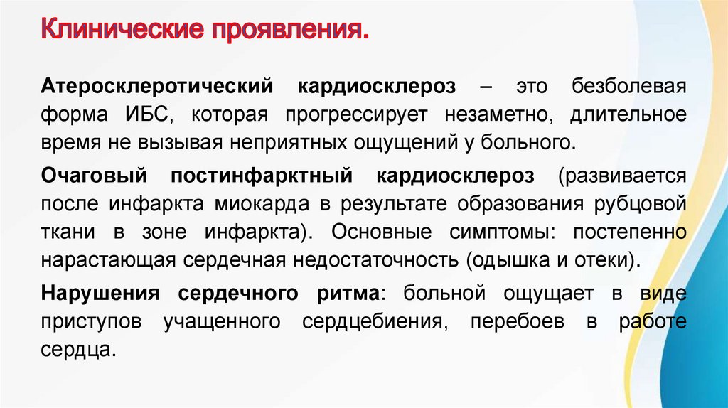 Атеросклеротический кардиосклероз – это безболеваяформа ИБС, которая прогрессирует незаметно, длительное