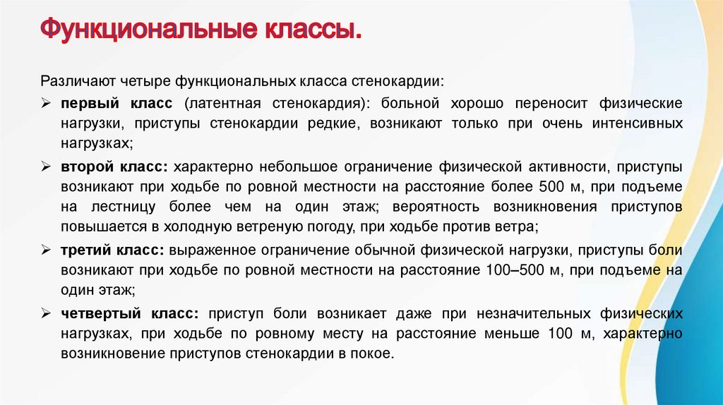Различают четыре функциональных класса стенокардии:первый класс (латентная стенокардия): больной хорошо переносит физические