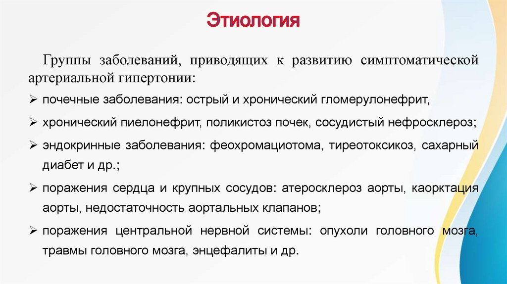 Группы заболеваний, приводящих к развитию симптоматическойартериальной гипертонии: