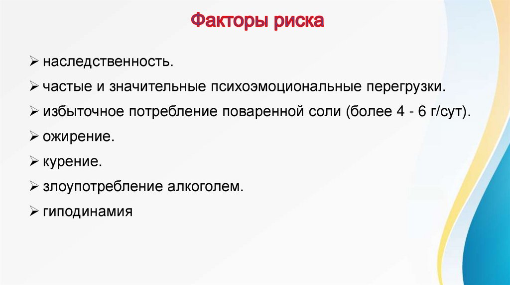 избыточное потребление поваренной соли (более 4 - 6 г/сут).