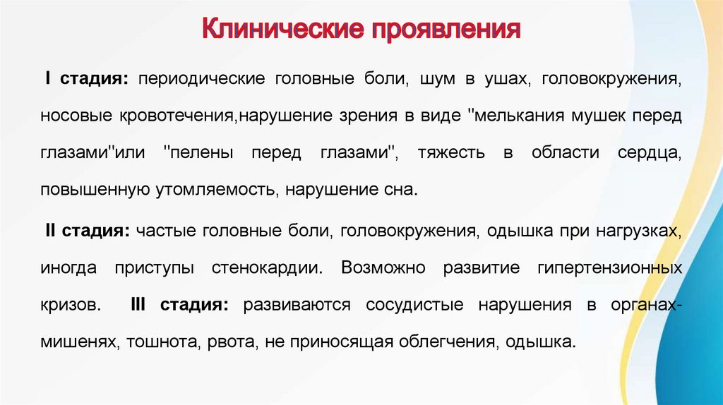 II стадия: частые головные боли, головокружения, одышка при нагрузках,